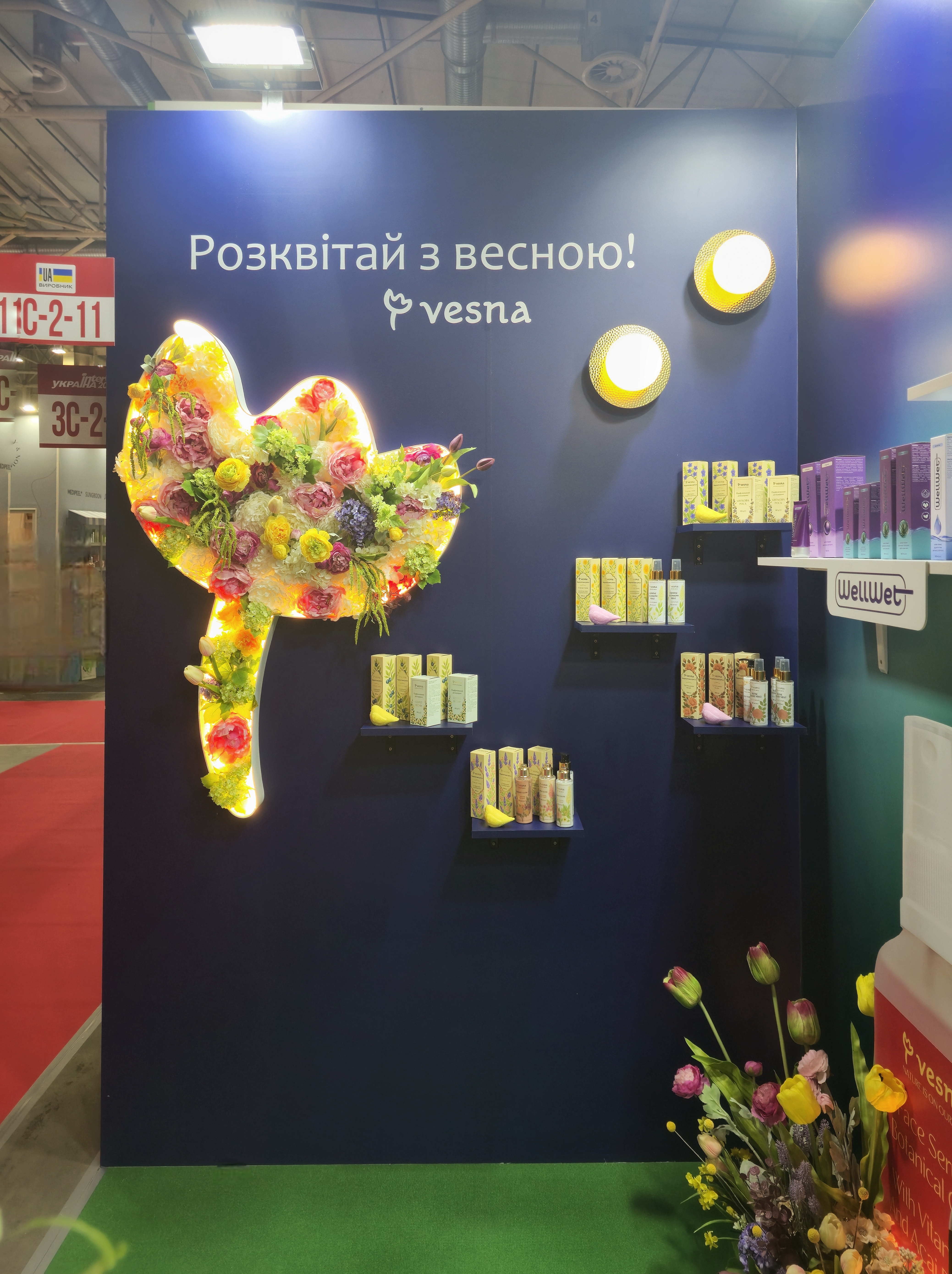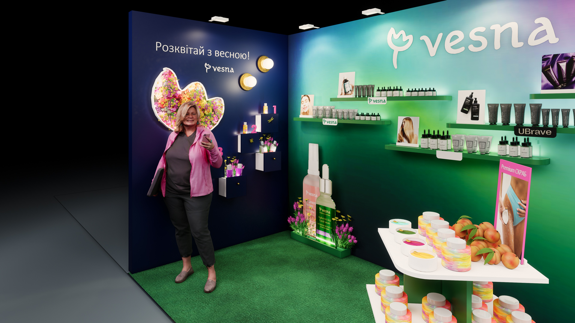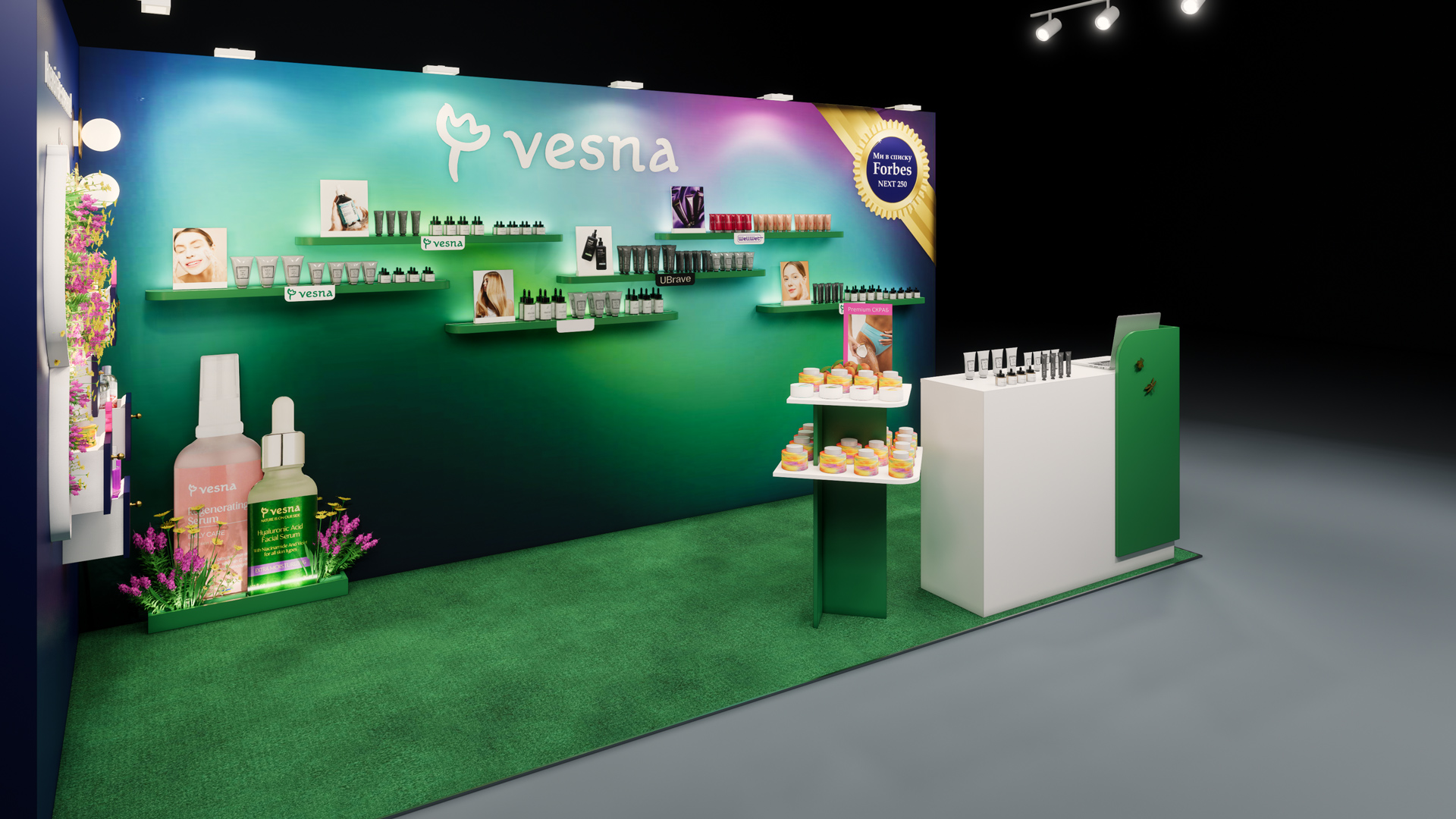 To enhance the WOW effect, we added jars of cosmetics and spring colors to the tall figures, which created a bright image that will be remembered. This design adds value to the Vesna brand, but also makes the stand attractive and welcoming for the exhibition guests.