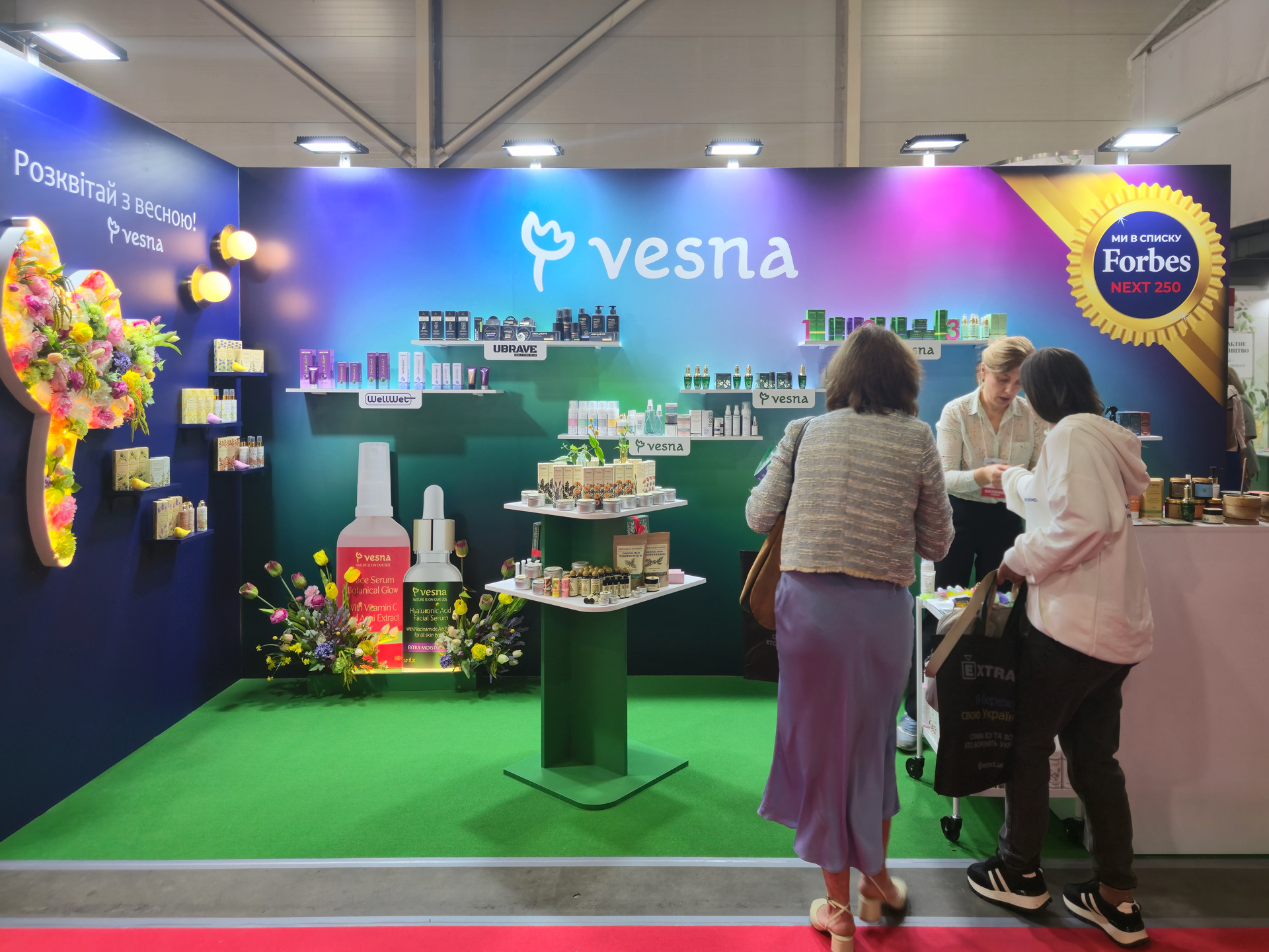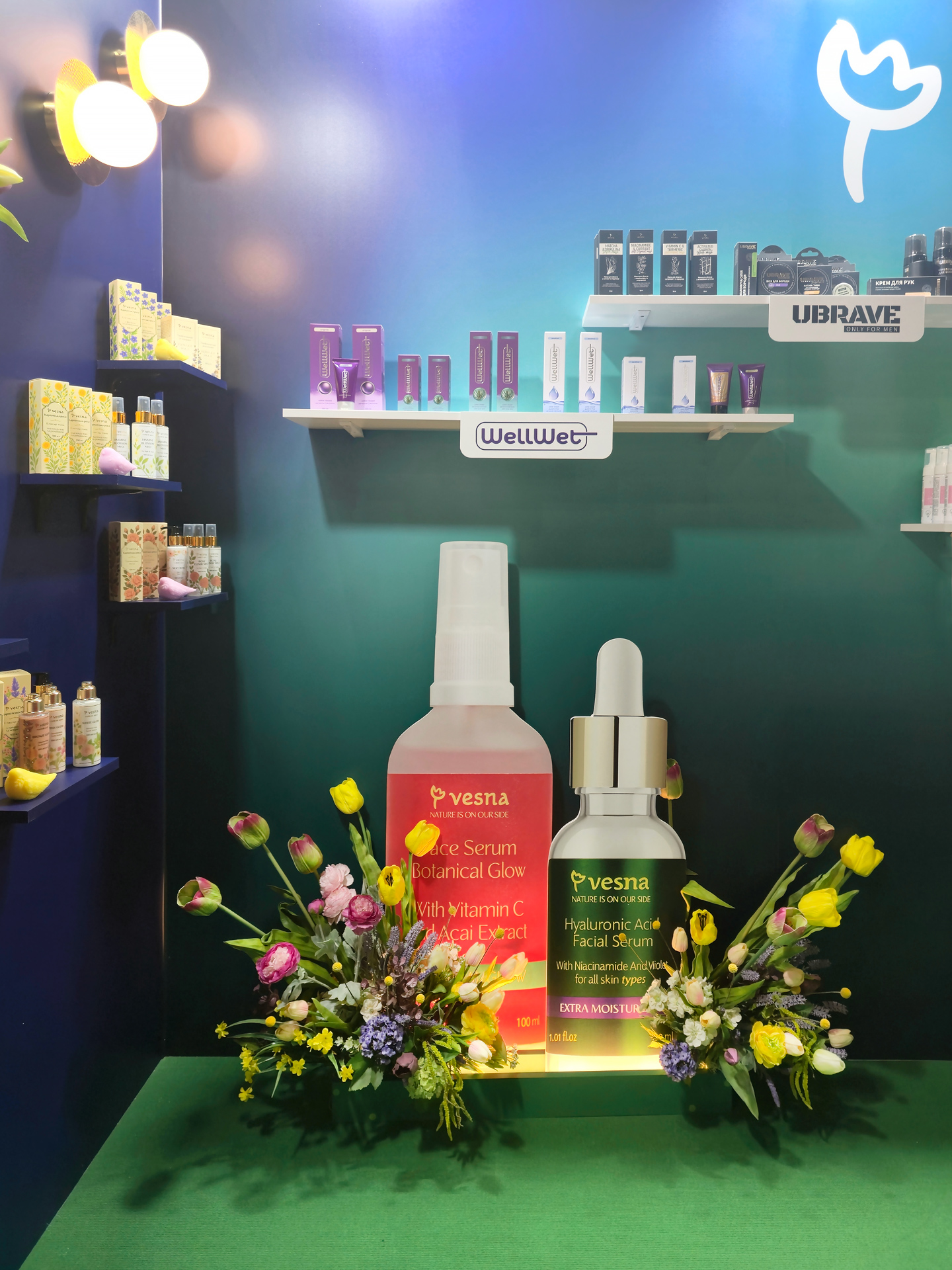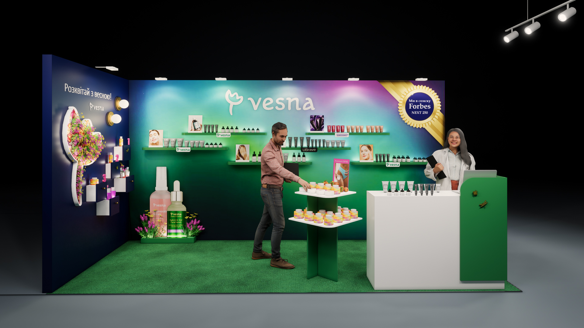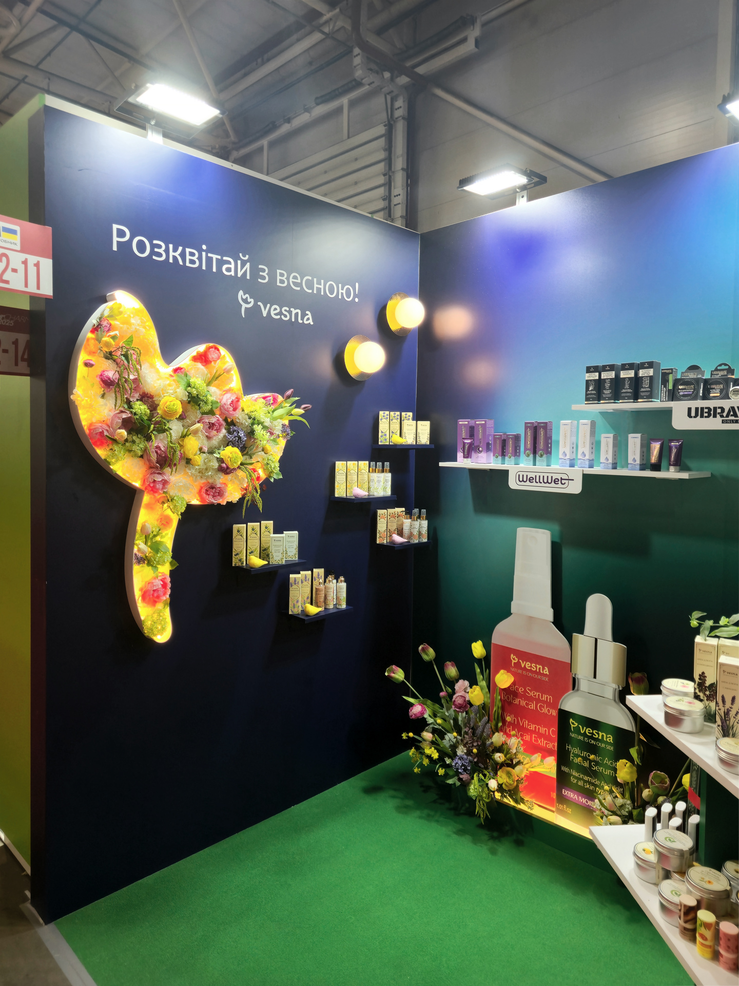 To enhance the WOW effect, we added jars of cosmetics and spring colors to the tall figures, which created a bright image that will be remembered. This design adds value to the Vesna brand, but also makes the stand attractive and welcoming for the exhibition guests.