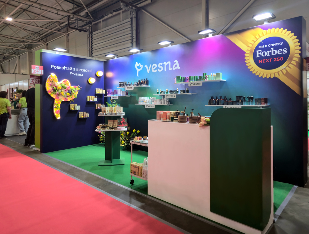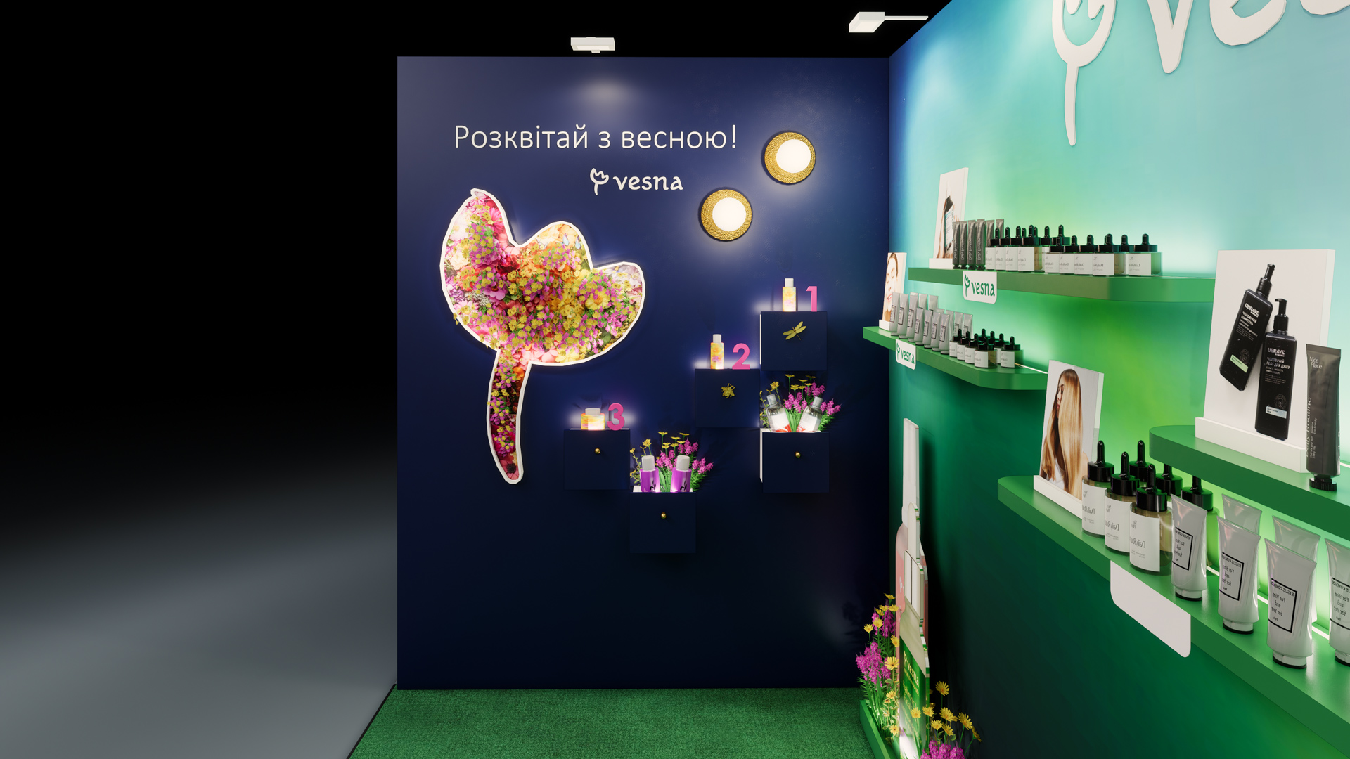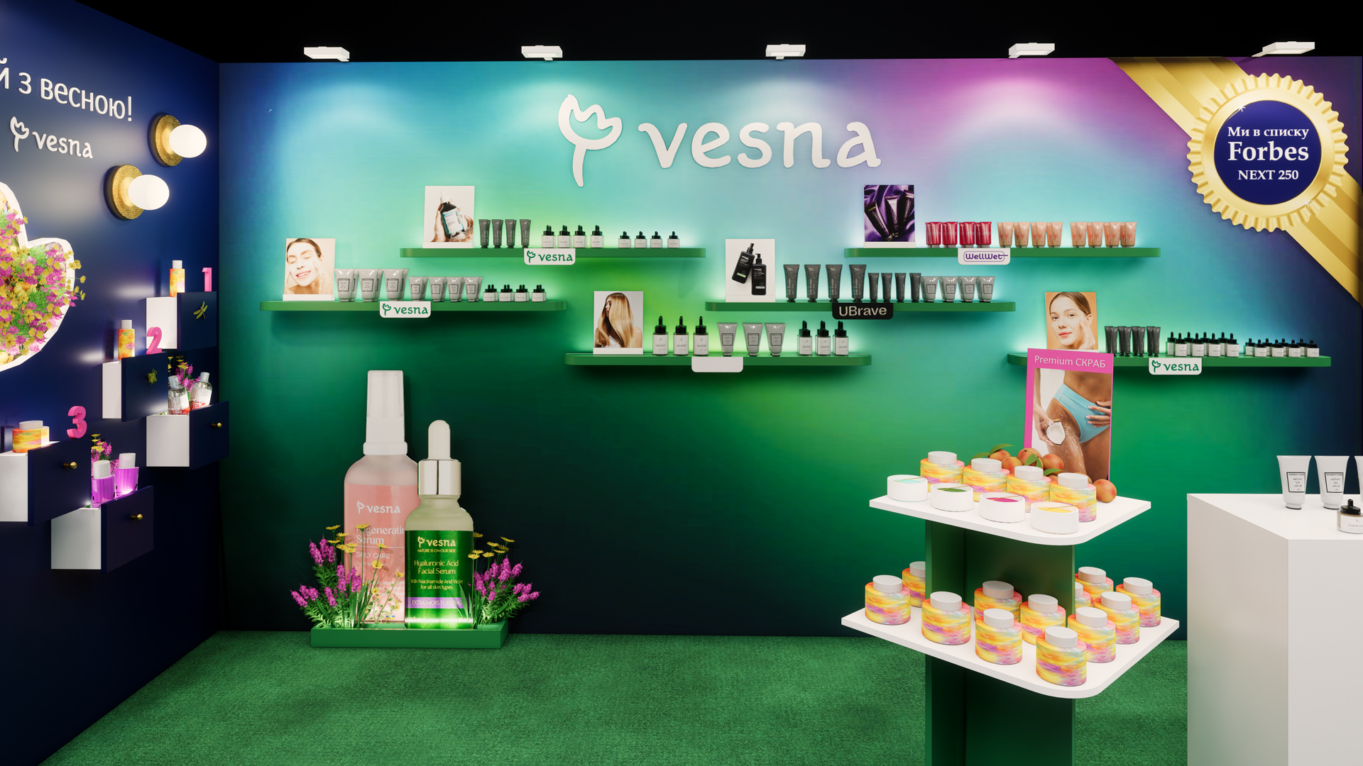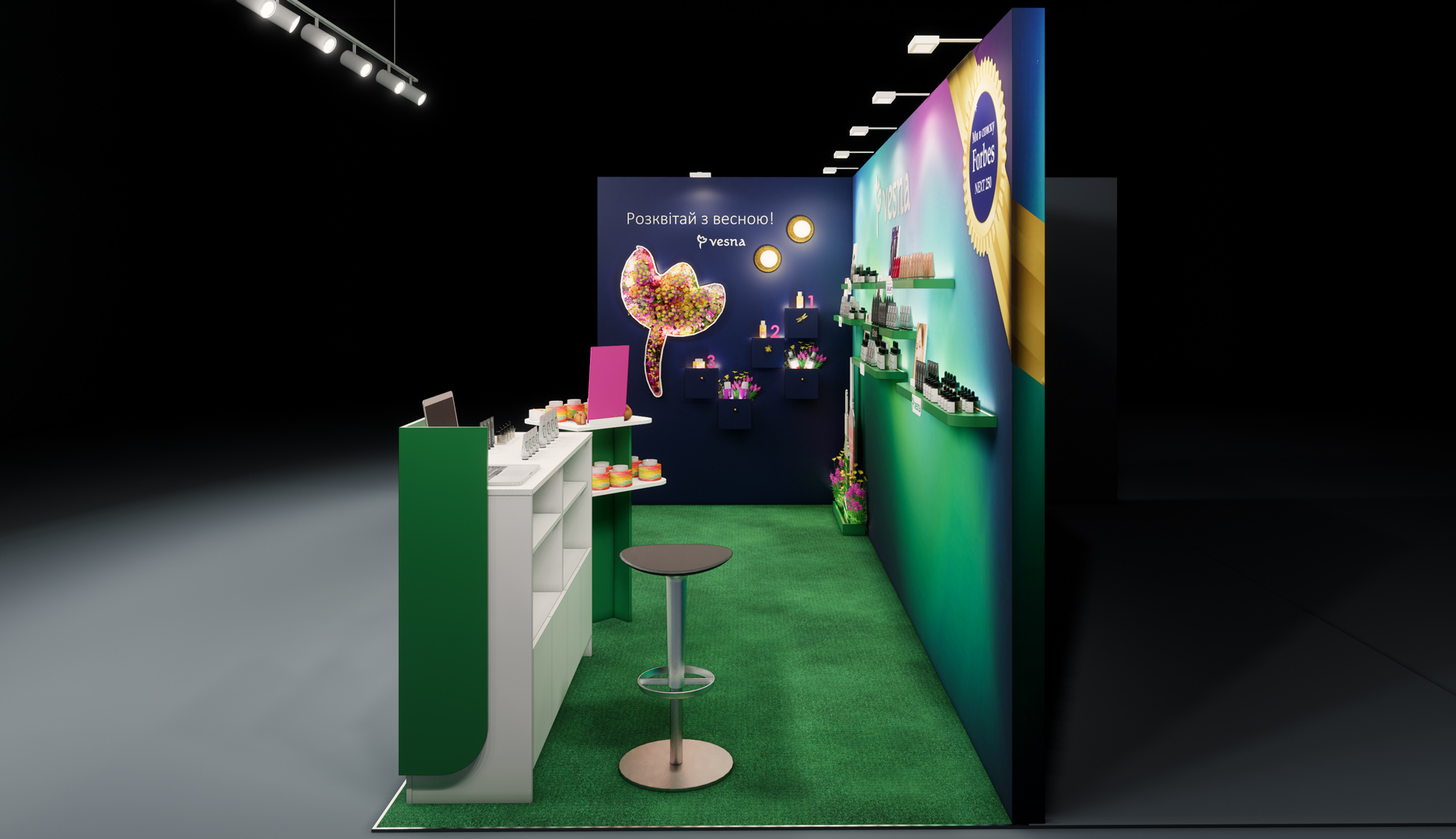 For the Ukrainian cosmetics brand “Vesna” we created an exhibition stand in a single concept with the design of the company store. The most characteristic elements of identity are the corporate gradient on the branding and color accents of the furniture, which allowed us to preserve a consistent visual image of the brand.